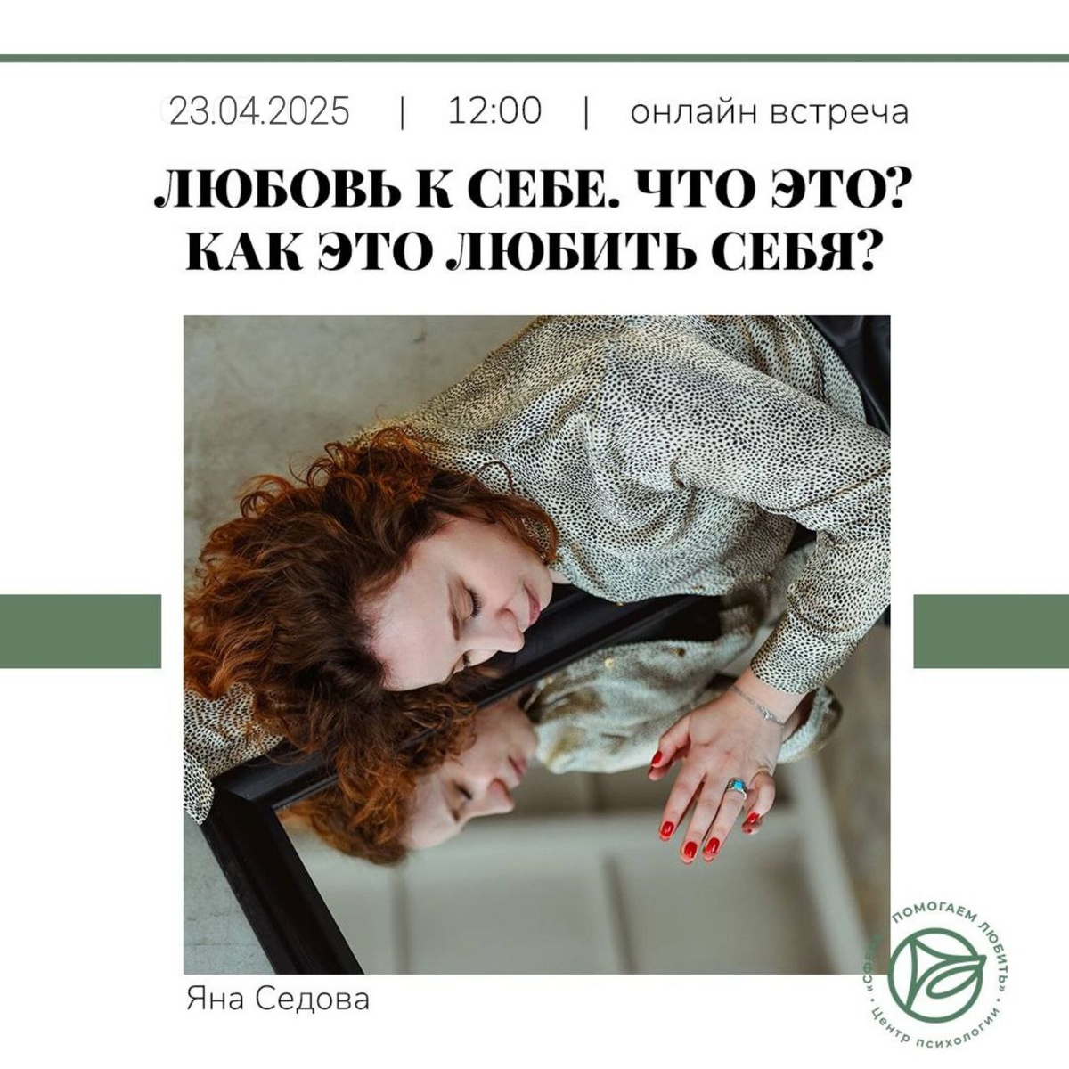 Приглашаем вас на терапевтическую лекцию «Любовь к себе. Что это? Как это любить себя?»🩷 В рамках этой лекции мы поговорим о том, что действительно означает заботиться о себе и как это может изменить вашу жизнь Мы обсудим, что любовь к себе — это не только маникюр и массаж, хотя это тоже приятно! Это целый спектр ощущений, действий и внутренней работы над собой. Каждый из нас интерпретирует эту любовь по-своему, и важно понять, какие именно практики помогут именно вам Не упустите возможность найти ответы на свои вопросы и научиться быть более бережным к себе Ждем вас на нашей встрече! Пусть любовь к себе станет важной частью вашей жизни 👉 👨 онлайн встреча 23.04.2025 👨 12:00 (Члб), 10:00 (Мск) 👨 Яна Седова 👨 1000 ₽