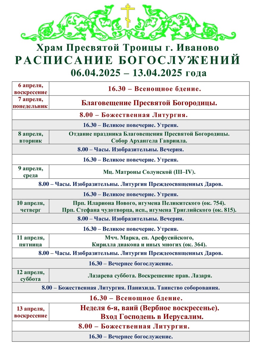 06-13.04. Расписание богослужений в Троицком храме города Иваново