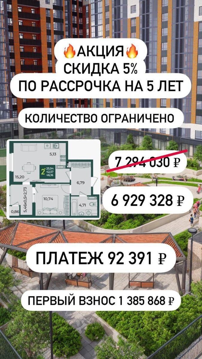 🔥Скидка 5% по рассрочке на 5 лет🔥 1-к квартира 41,50 м² Стоимость: 6 455 325 ₽ ПВ: 1 291 065₽ Ежемесячный платёж: 86 071₽ Новый стандарт комфортной жизни: ✨ 4 детских сада и школа 🎒 на 1875 мест, ✨ Подземные и многоуровневые парковки 🚗, ✨ Современная поликлиника 🏥, ✨ И, конечно, парк Флагманский 🌳 площадью 42 тыс. кв. м. – сердце микрорайона! Транспортная доступность 🚋 на высшем уровне: - Трамвайная ветка прямо за комплексом к 2028 году 🚊, - 10 минут до краевой клинической больницы 🏥, - 15 минут до парка Галицкого и стадиона «Краснодар» ⚽, - 35 минут до центра города 🏛️, - 15 минут до выезда на трассу М-4 «Дон» 🛣️ Для получения подробной информации обращайтесь 📲89181880666 Алексей #акция #недвижимость #краснодар #рассрочка #квартиракраснодар #купить