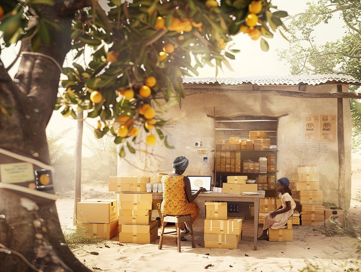 Создано на основе запроса: Photorealistic scene: Fatou sits at a wooden table under a tree, using a smartphone and a solar-powered laptop. Around her: boxes of products ready to ship (soap, moringa powder, dried fruits). Her Instagram page is open on screen. In the background, a child helps organize packages. Light ambiance, rural innovation vibe.
