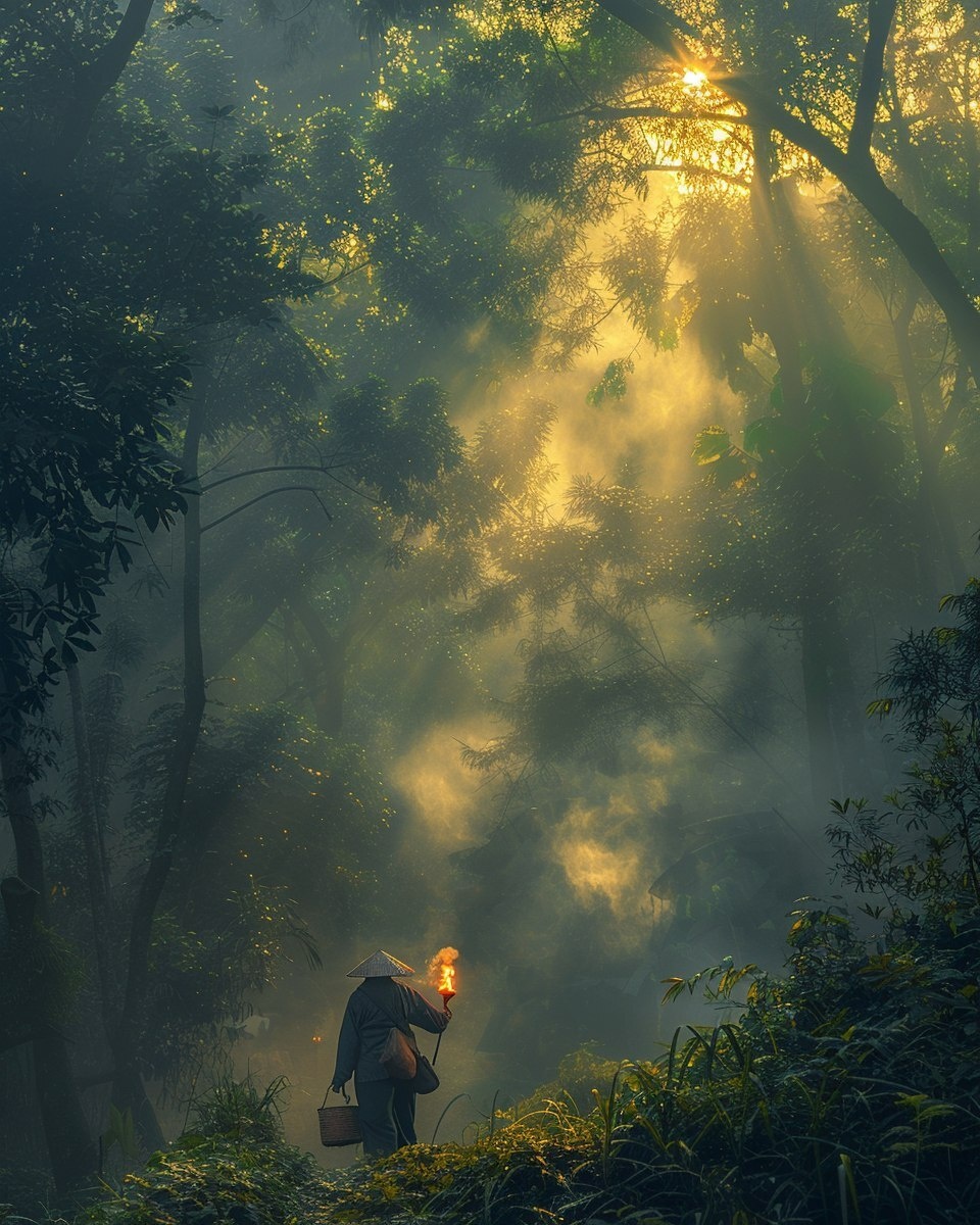 Создано на основе запроса: A scenic sunrise in the deep forest of Dien Khanh, Vietnam, a Tay ethnic man walking with a basket and torch on