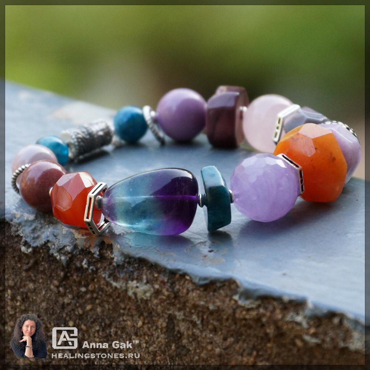 Тут очень красивый баланс творческого порыва (флюорит), удовольсвтияи от процесса (сердолик) и расслабления, отсутсвия треводности (лепидолит, лавандовый кварц).