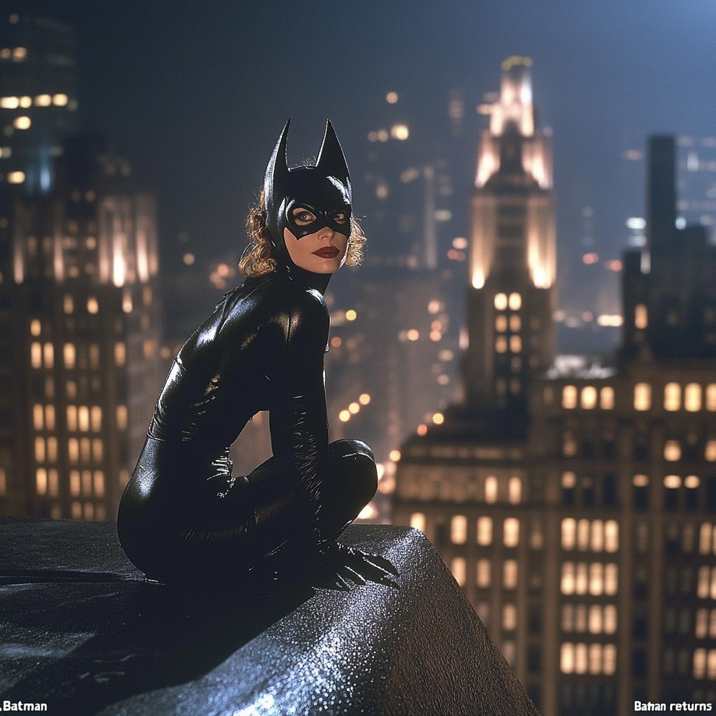Создано на основе запроса: "Batman returns" (1992) - Michelle Marie Pfeiffer as catwoman is on the roof of a skyscraper in Gotham City