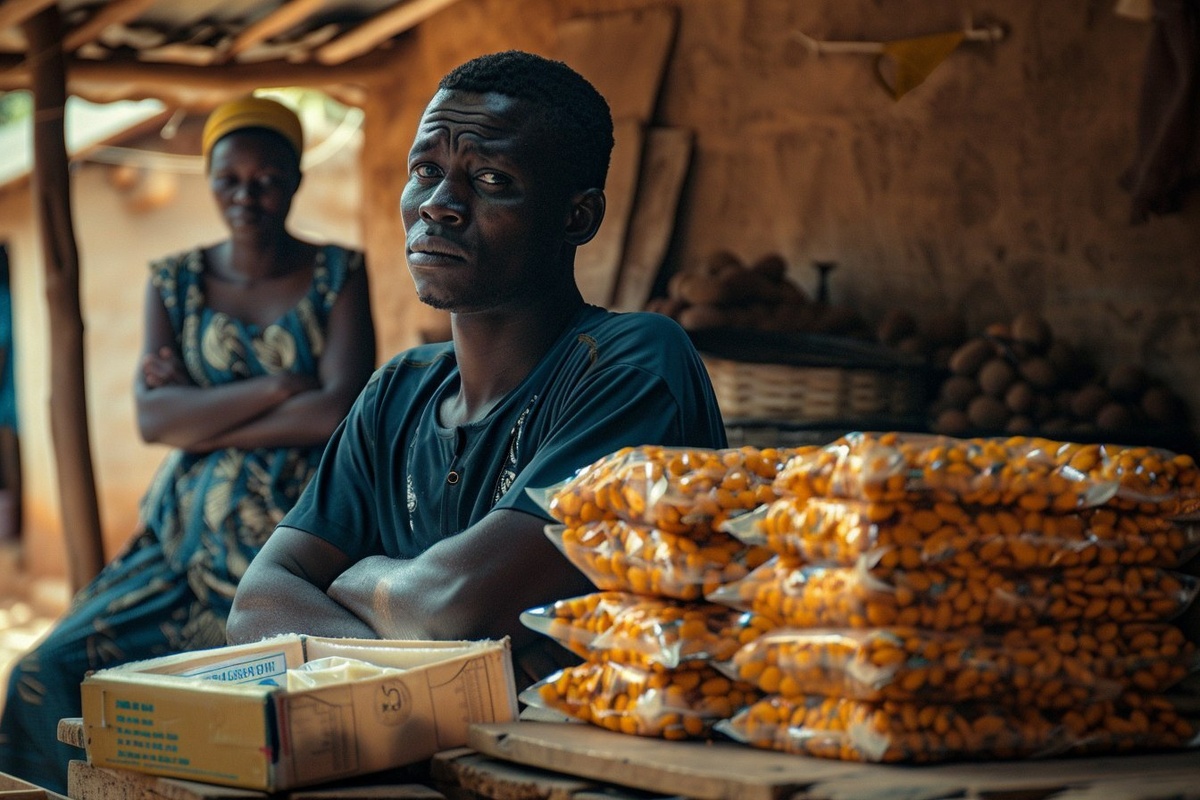 Создано на основе запроса: Photorealistic rural African market scene stacks of dried mango packages on a wooden table, untouched by customers. A young African man (Moussa) sits nearby, visibly frustrated, calculating something with a pen and notepad. Fatou stands behind him, arms crossed, reflective. The vibe is tense but calm a moment of strategic pause. Warm afternoon light, earthy market tones, textured realism. --- Автоперевод: Фотореалистические сельские африканские рыночные сцены Стоки сушеных пакетов манго на деревянном столе, нетронутой клиентами. Классно выглядит? 🤔 https://dzen.ru/id/65c0c65c86e4f837c27b24d7 #ИИ #AI #нейросеть #midjourney #art