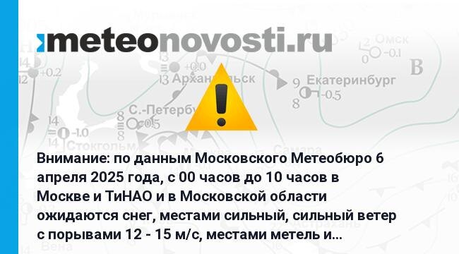 Внимание: по данным Московского Метеобюро 6 апреля 2025 года, с 00 часов до 10 часов в Москве и ТиНАО и в Московской области ожидаются снег, местами сильный, сильный ветер с порывами 12 - 15 м/с, местами метель и снежный накат. Перейти на сайт Прогноз погоды на 14 дней