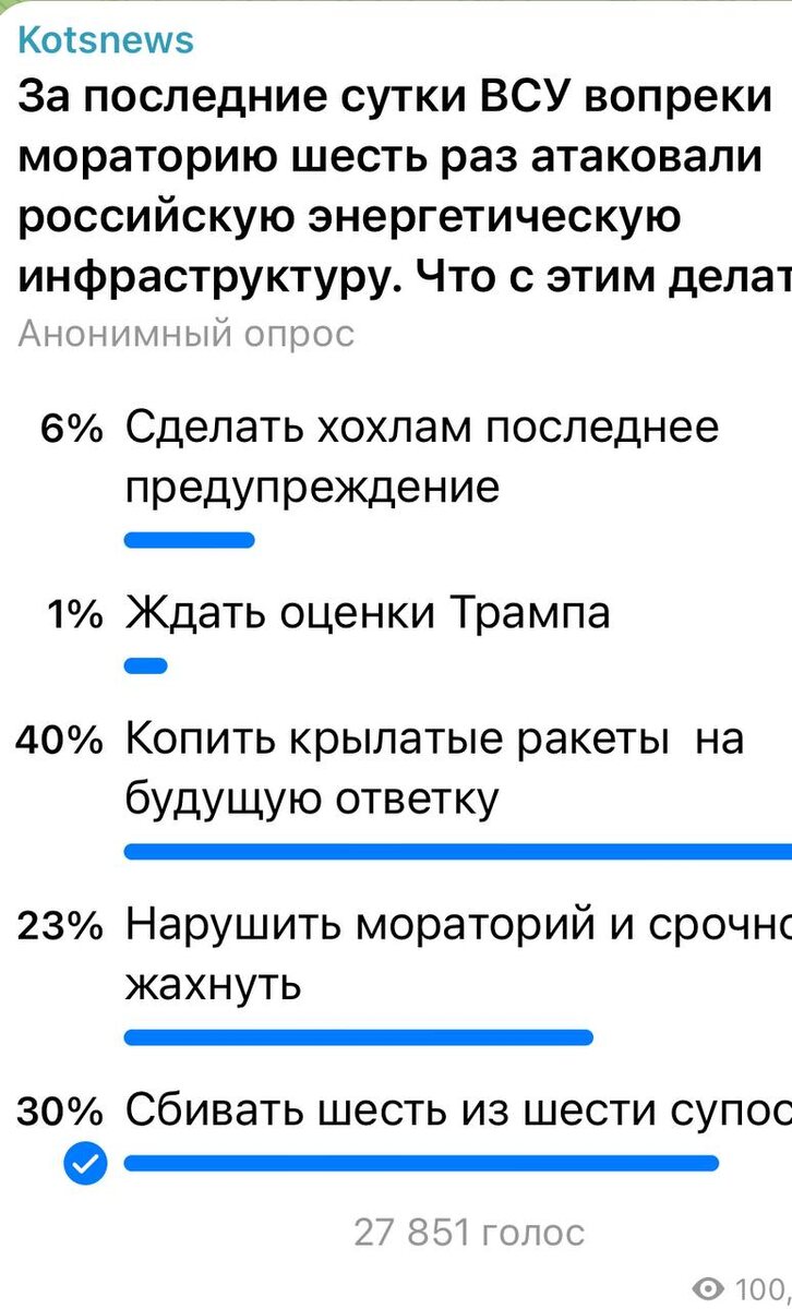 40 процентов проголосовавших считают, что надо не торопиться, а копить ракеты. Месть - блюдо, которое надо подавать холодным.