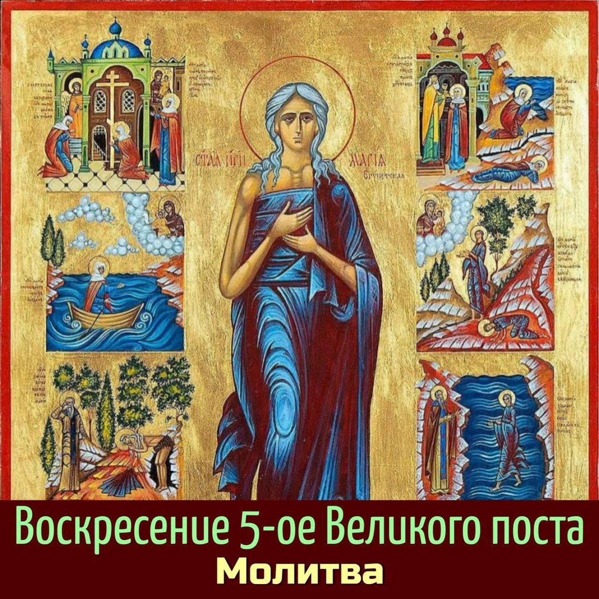 Молитва преподобной Марии Египетской с переводом на русский язык. О, вели́кая Христо́ва уго́днице, преподо́бная Мари́е! На Небеси́ Престо́лу Бо́жию предстоя́щи, на земли́ же ду́хом любве́ с на́ми пребыва́ющи, име́ющи дерзнове́ние ко Го́споду, моли́ спасти́ рабы Его́, к тебе́ с любо́вию притека́ющия. Испроси́ нам у Великоми́лостиваго Влады́ки и Го́спода ве́ры непоро́чное соблюде́ние, градо́в и ве́сей на́ших утвержде́ние, от гла́да и па́губы избавле́ние, скорбя́щим – утеше́ние, неду́гующим – исцеле́ние, па́дшим – возста́ние, заблу́ждщим – укрепле́ние, в дела́х благи́х преспе́яние и благослове́ние, сирота́м и вдови́цам – заступле́ние и отше́дшим от сего́ жития́ – ве́чное упокое́ние, всем же нам в де́нь стра́шнаго Суда́ одесну́ю страны́ о́бщники бы́ти и блаже́нный глас Судии́ ми́ра услы́шати: прииди́те, благослове́ннии Отца́ Моего́, насле́дуйте угото́ванное вам Ца́рствие от сложе́ния ми́ра, и та́мо пребыва́ния во ве́ки получи́ти. Ами́нь. Перевод: О, великая Христова угодница преподобная
