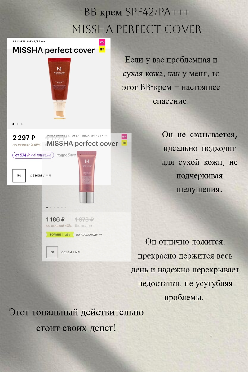 Девочки, кажется, я нашла ЕГО! 💘 Тональный крем, о котором я так долго мечтала! После долгих поисков я наконец-то попробовала: BB крем SPF42/PA+++ Missha Perfect Cover, и это просто любовь с первого нанесения! 🤩 Раньше я всегда мучилась с тональными кремами: то слишком плотные, то подчеркивают шелушения, то просто не держатся на моей коже. Но этот… это просто волшебство! ✨ В общем, если вы ищете идеальный тональный крем, который сделает вашу кожу красивой и ухоженной, настоятельно рекомендую попробовать . Вы не пожалеете! 😉