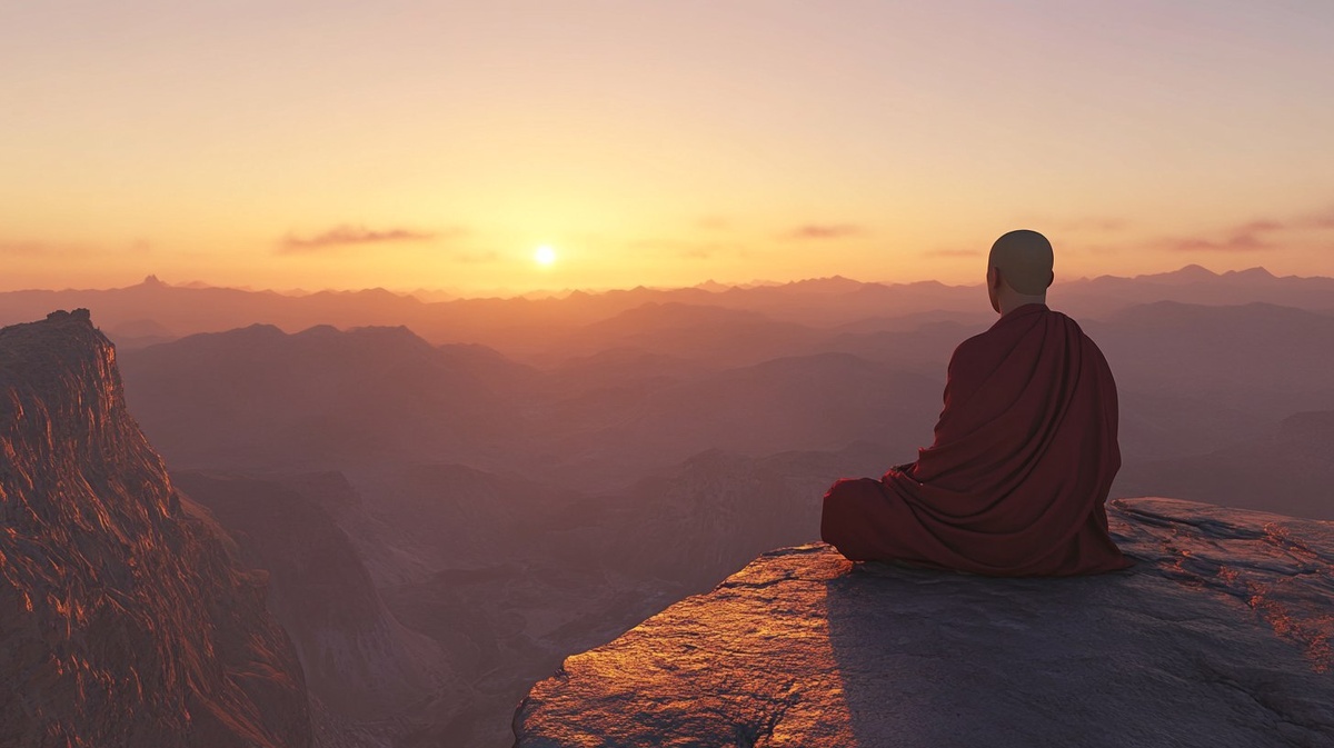 Создано на основе запроса: A serene Buddhist monk sitting on a mountain ledge at sunrise, gazing into the vast horizon, pondering the nature