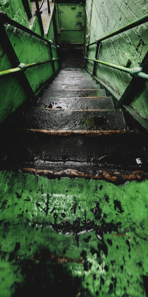 Создано на основе запроса: bottom of the stairs. Liminal space. Green hue. Grimy. Grungy. Wet.