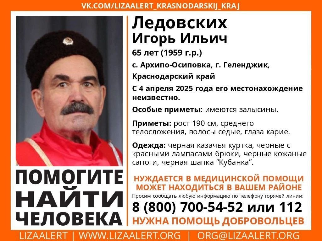 #Ледовских Игорь Ильич, 65 лет (1959 г.р.), с. #Архипо-Осиповка, г. #Геленджик, #Краснодарский край С 4 апреля 2025 года его местонахождение неизвестно. Приметы: рост 190 см, среднего телосложения, волосы седые, глаза карие. Особые приметы: имеются залысины. Одет: черная казачья куртка, черные с красными лампасами брюки, черные кожаные сапоги, черная шапка “Кубанка”. Горячая линия отряда: 8 800 700 5452 (звонок бесплатный) Инфорг поиска: НаталиЯ 89282072781