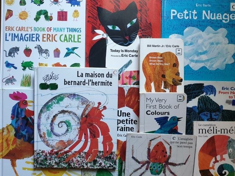 Дома у нас нет ни одной книги Эрика Карла. Хотя знакомы нам некоторые. Конечно, Голодная гусеница. Морской конёк, что заботливый папа. Ещё что-то брали в библиотеке, когда дочка была маленькой. Хочу вам показать несколько книг американского автора и иллюстратора, чьи работы стали классикой малышковой литературы в западном мире и имеют популярность в России тоже. На русском его книги выходят в издательстве "Розовый жираф". *** Сегодня Понедельник/ Today is Monday Песенка с повторами про дни недели и хороший аппетит. Её придумал не Эрик Карл, но он забавно её иллюстрировал. Все звери из песенки присутствуют на последней иллюстрации - своего рода подсказка. Можно найти эту песнку в озвучке. Моя первая книга цветов Это картонка-листалка. Нужно подобрать цвет к картинке. Отпечатки грязных пальчиков, какие-то каракули... видно, что малышам часто берут её) Словарь в картинках Домик для краба-отшельника/ A House for Hermit Crab Здесь краб в поиске подходящей по размеру ракушки-домика. А пот