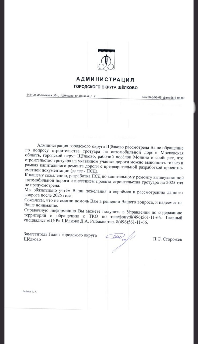Строительство тротуара не предусмотрено. И так все ответы по Монино каждый год совершенно ничего не предусмотрено.