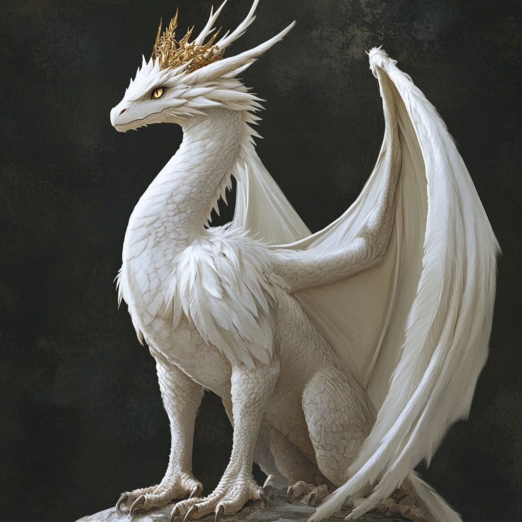 Создано на основе запроса: full body image of realistic grown dragon, white feathers, golden eyes, arms for wings, golden crown, thin snout