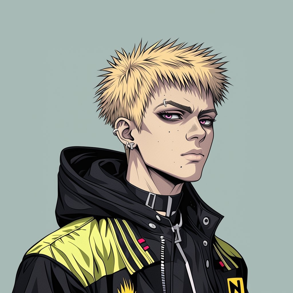 Автоперевод: Портрет профиля Katsuhiro Otomo - стиль Акира, мужской персонаж, черные пирсинговые глаза, блондинка