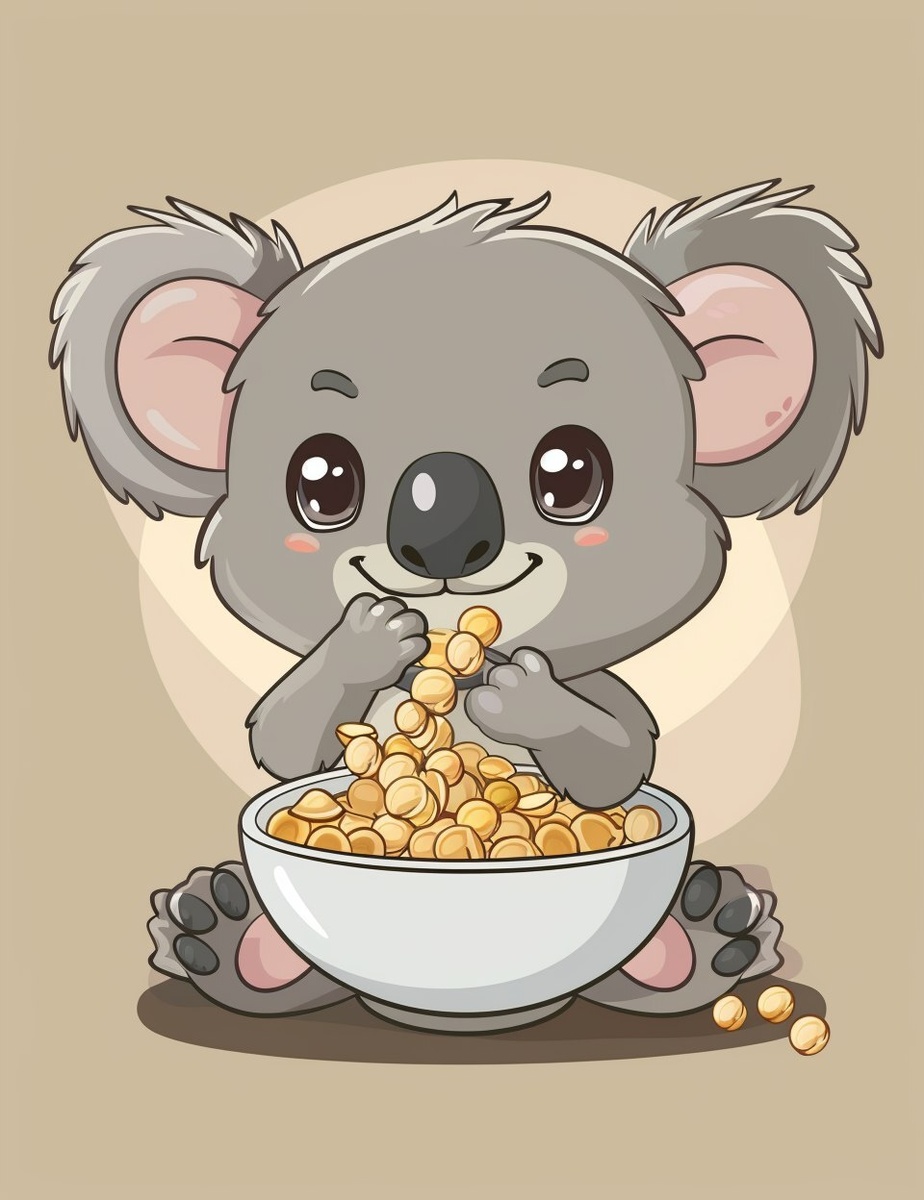 Создано на основе запроса: A cartoon koala eating from a large bowl of eucalyptus cereal