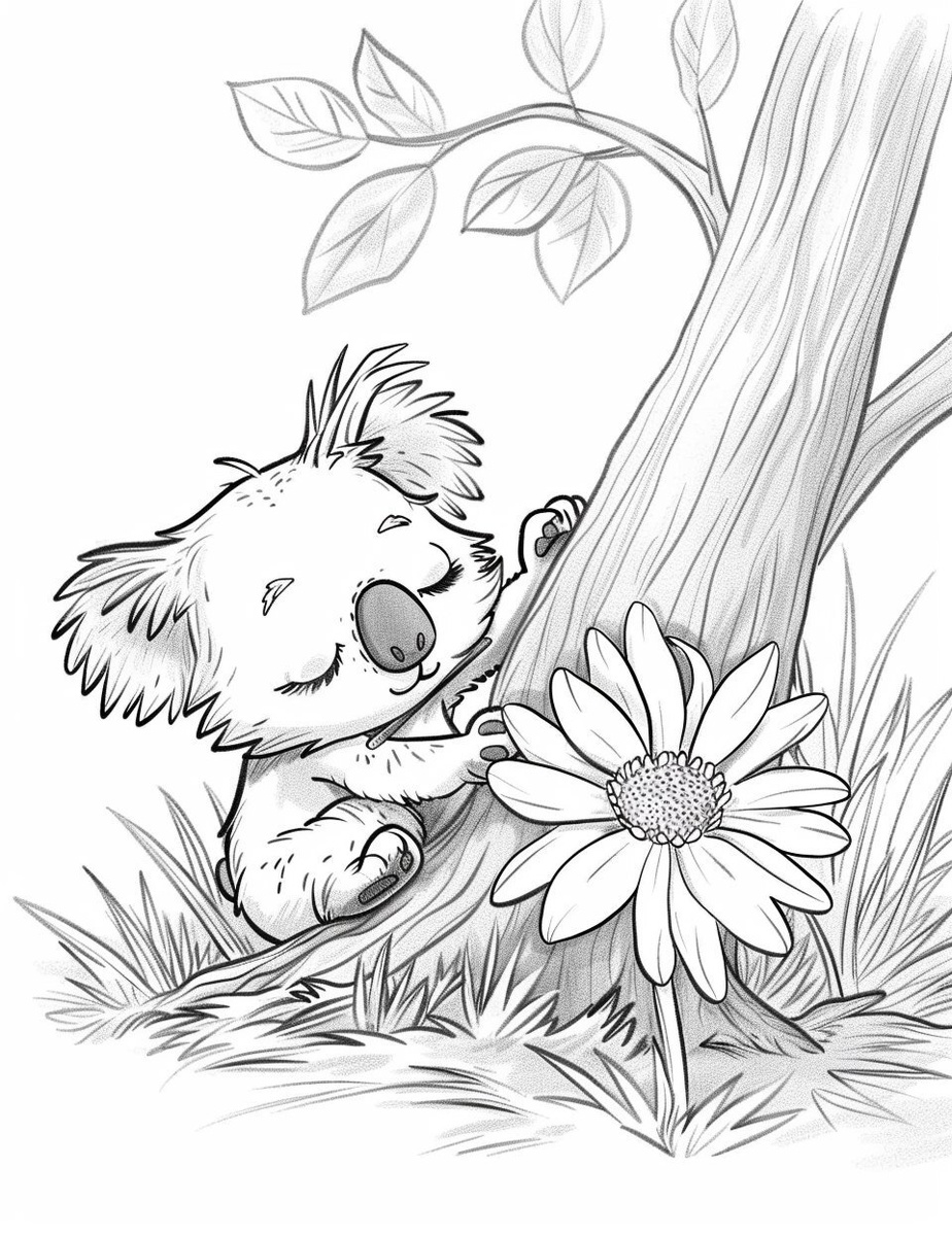 Создано на основе запроса: A simple black-and-white coloring page for toddlers (3 years old) showing a cute cartoon koala waking up in a tree. A cartoon koala sniffing a big flower. One big flower only, no grass or extra background. --- Автоперевод: Простая черно-белая раскраска для малышей (3 года), показывающая милую мультипликационную коалу, просыпалась на дереве. Интересно выглядит? 🤔 https://dzen.ru/id/65c0c65c86e4f837c27b24d7 #ИИ #AI #нейросеть #midjourney #art