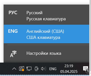 - Панель задач: В правом нижнем углу экрана нажмите на значок языка (например, "RU" для русской раскладки) и выберите "EN" (или "Английский").