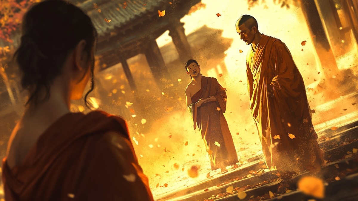 Создано на основе запроса: A photorealistic scene of a man and woman arguing intensely in the foreground, their bodies subtly entangled by glowing ribbons, symbolizing emotional tension and attachment. Both have expressive faces showing frustration and emotional pain. In the background, a calm Buddhist monk in traditional saffron robes stands peacefully under soft golden sunlight, observing the couple with a serene and compassionate gaze. The setting is natural and grounded a quiet outdoor space with fallen autumn leaves and gentle light filtering through trees, highlighting the contrast between turmoil and inner peace --- Автоперевод: Фотореалистическая сцена мужчины и женщины, которые интенсивно спорят на переднем плане, их тела тонко запутались светящимися лентами, символизируя эмоциональное напряжение и привязанность. Хорошо получилось? 🤔 https://dzen.ru/id/65c0c65c86e4f837c27b24d7 #ИИ #AI #нейросеть #midjourney #art