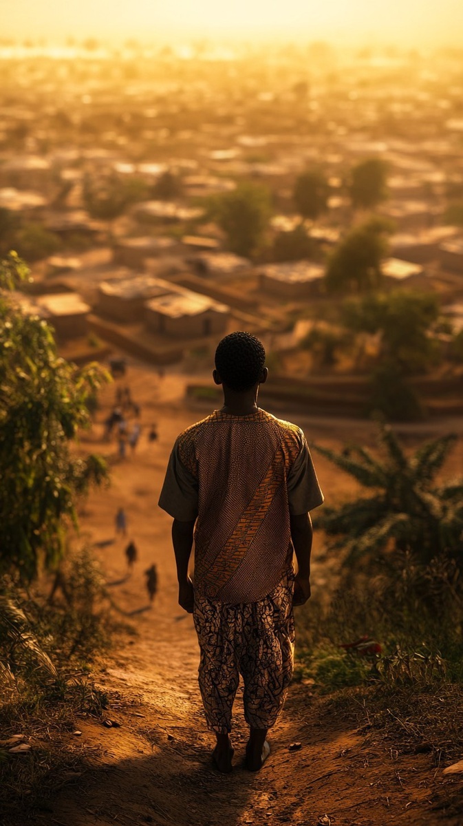 Создано на основе запроса: A realistic photograph-style scene showing a young African man standing on a dirt path overlooking a rural