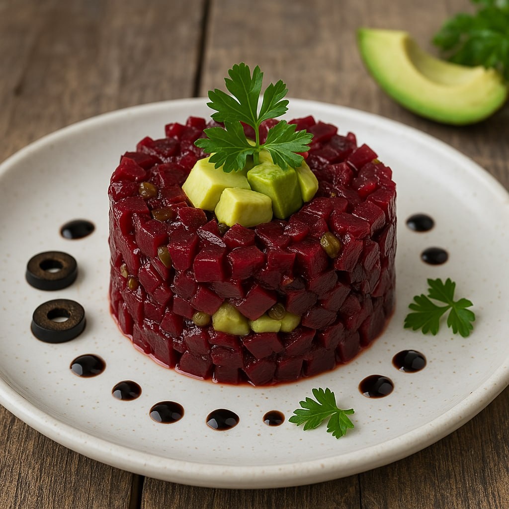 Приветствую вас на канале "Карамелька"! Свекольный тартар с сюрпризом — эффектная закуска за 15 минут Привет, друзья! Сегодня у меня для вас не просто салат, а настоящий кулинарный шедевр! Свекольный тартар с сюрпризом. Если вы хотите удивить гостей или порадовать себя чем-то вкусным и необычным — этот рецепт точно для вас! Салат готовится очень быстро. Во-вторых, выглядит как из ресторана. А в-третьих — свёкла в таком формате раскрывается совсем по-новому: свежо, ярко, пикантно. А «сюрприз» внутри делает блюдо не только красивым, но и интригующим 😉 📌Для приготовления нам понадобятся следующие продукты: (на 2 порции): Как готовить: Мелко нарезаем свеклу, лук, маринованный огурчик и каперсы. Всё должно быть аккуратным кубиком — почти как настоящий тартар из тунца Заправляем: добавляем оливковое масло, немного бальзамика, соль, перец. Перемешиваем. Пробуем. Оно уже вкусно! Готовим “сюрприз” внутри. Нарезаем авокадо кубиком или формируем шарик из мягкого сыра. Можно добавить щепотк