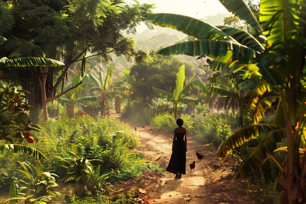 Создано на основе запроса: Photorealistic permaculture forest garden in rural West Africa dense, multilayered vegetation with banana trees