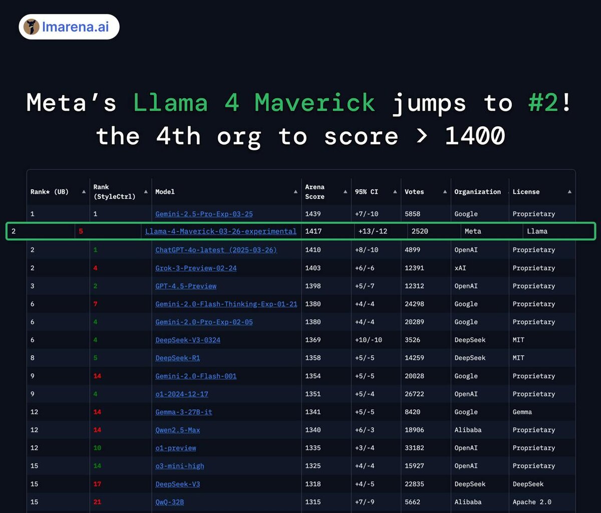π₯Llama 4 Maverick Π·Π°Π½ΠΈΠΌΠ°Π΅Ρ 2-Π΅ ΠΌΠ΅ΡΡΠΎ ΡΡΠ°Π² 4-ΠΉ ΠΌΠΎΠ΄Π΅Π»ΡΡ, ΠΏΡΠ΅ΠΎΠ΄ΠΎΠ»Π΅Π²ΡΠ΅ΠΉ ΠΎΡΠΌΠ΅ΡΠΊΡ 1400+ Π½Π° ΠΡΠ΅Π½Π΅ , ΡΡΡΡΠΏΠ°Ρ Π»ΠΈΡΡ Gemini 2.5 Pro