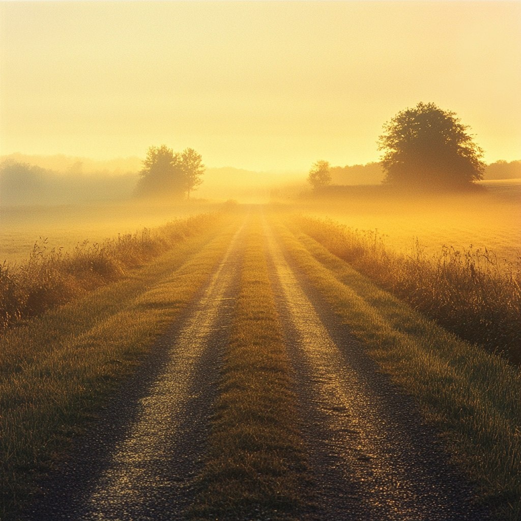 Создано на основе запроса: A quiet path or road leading into the horizon, bathed in the soft golden glow of early morning