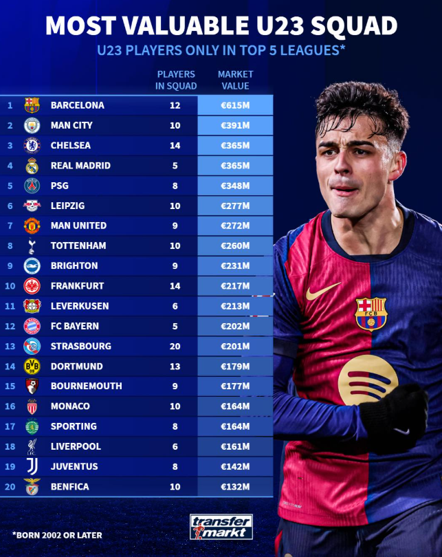 🤑 Топ-20 клубов Европы с самой дорогой молодежью в составе. У «Барсы» вообще есть конкуренты?