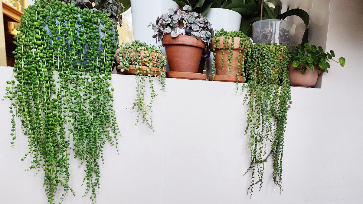 Итак, горох, он же крестовник роули. Сукуулент, лиана, милое чудо с шариками вместо листьев, которое у почему-то не у всех растёт. Показываю и рассказываю, почему он растёт у меня. Горох любит солнце, но умеренное - под прямыми лучами горошины светлеют. И ему нужно тепло. Не ниже 22 градусов стабильно, если будет меньше, по моим наблюдениям горох становится треугольным и синеет - это ему холодно. Темноту он переносит средне: не тухнет (если не заливаете, конечно), но и не растёт. А вот в жаре и влажности - прёт как на дрожжах. В этом один из секретов моего гороха - он стоит на южном балконе, летом там жара, зимой там отопление, солнца - завались. Большой зимой живёт у мамы. Для красоты. В самом теплом и светлом углу над батареей. Я забираю его на время дачи и рассады. Делю на две части - одну в свежий грунт в этот же горшок, вторую - на стаканчики и на продажу. В прошлом году горох лето провел у мамы и благополучно закончился к августу - домой они заезжали редко, с негерулярным поли