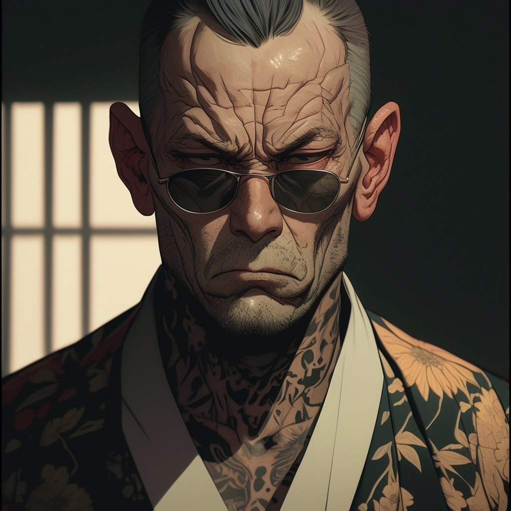 Создано на основе запроса: An old charismatic japanese mob boss. Male character, short hair, sunglasses, sit in a subtle low-light office, he looks serious and stern, poker face. Very skinny with pale cheeks. He looks straight at the camera - He wears a a clean white and black kimono and tattoos around his neck. Concept art illustration, cartoon art style, comic book quality, gritty comic book art style, airbrush illustration style, semi-realistic manwha art style, digital portrait, detailed shadows, detailed colors, ultrahigh definition, --- Автоперевод: Старый харизматичный японский босс мафии. Какое твое мнение? 🤔 https://dzen.ru/id/65c0c65c86e4f837c27b24d7 #ИИ #AI #нейросеть #midjourney #art
