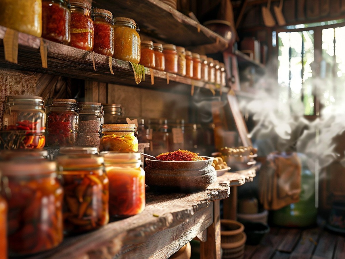 Создано на основе запроса: Photorealistic scene inside a small, clean processing hut glass jars of fermented chili paste, vinegar, and attiéké line a wooden shelf. Fatou stirs a bubbling vat with a wooden paddle. Moussa labels bottles in the background. Lacto-fermentation and natural yeast at work. Natural ambient light, steam and shadows, strong earthy tones. --- Автоперевод: Фотореалистическая сцена внутри маленьких чистых обработчиков стеклянных банок с ферментированной пастой из чили, уксуса и Аттике линии деревянной полки. Как тебе это изображение? 🤔 https://dzen.ru/id/65c0c65c86e4f837c27b24d7 #ИИ #AI #нейросеть #midjourney #art
