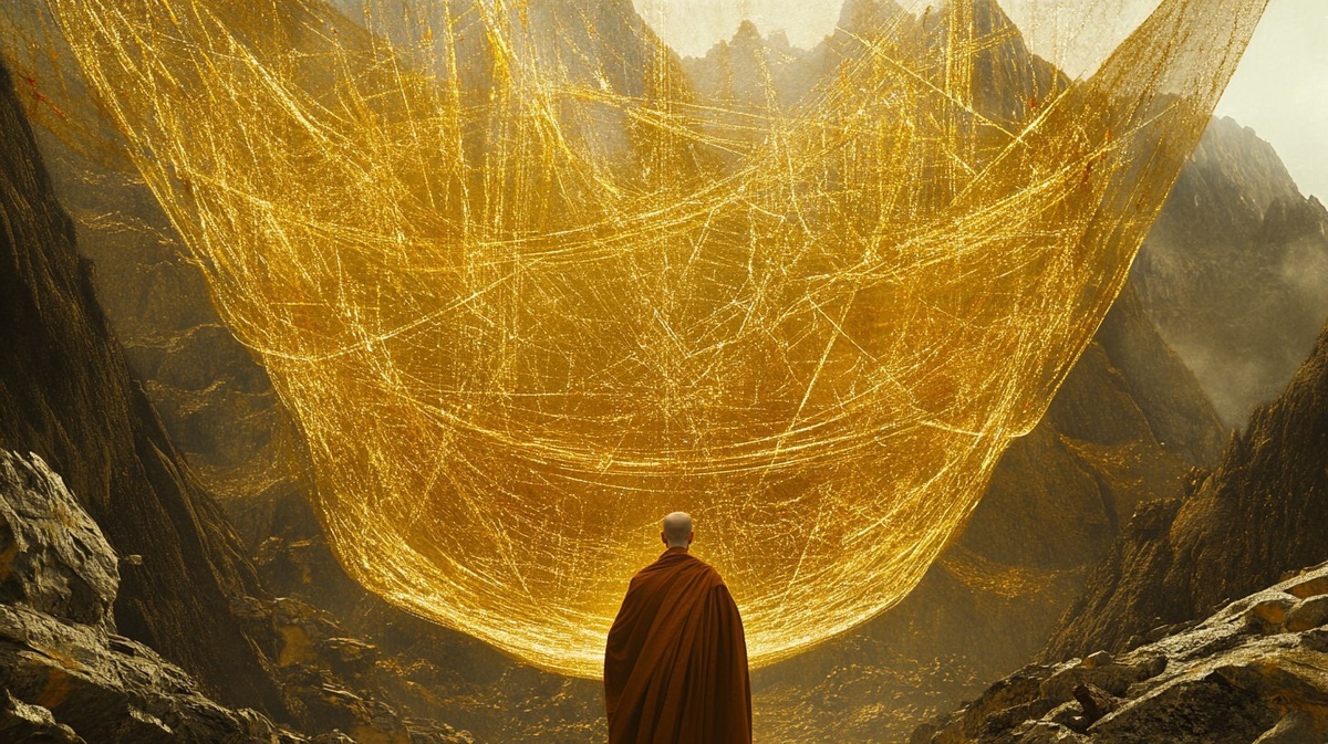 Создано на основе запроса: A giant golden web suspended between mountains, with scenes of joy and sorrow woven into it the monk standing at