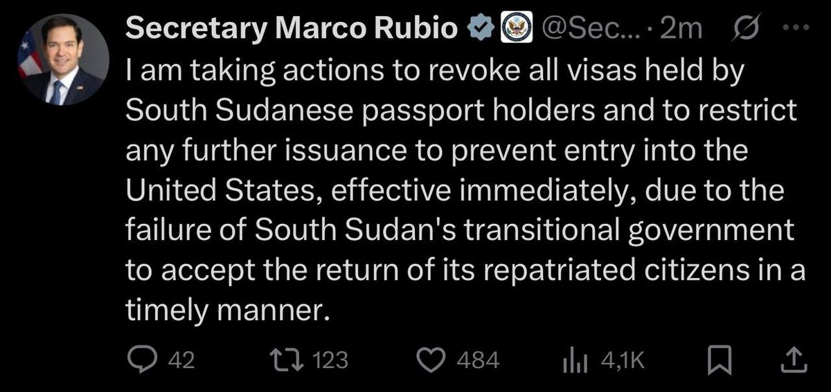 ❗️US cancels ALL visas for South Sudanese passport holders — Sec of State Rubio