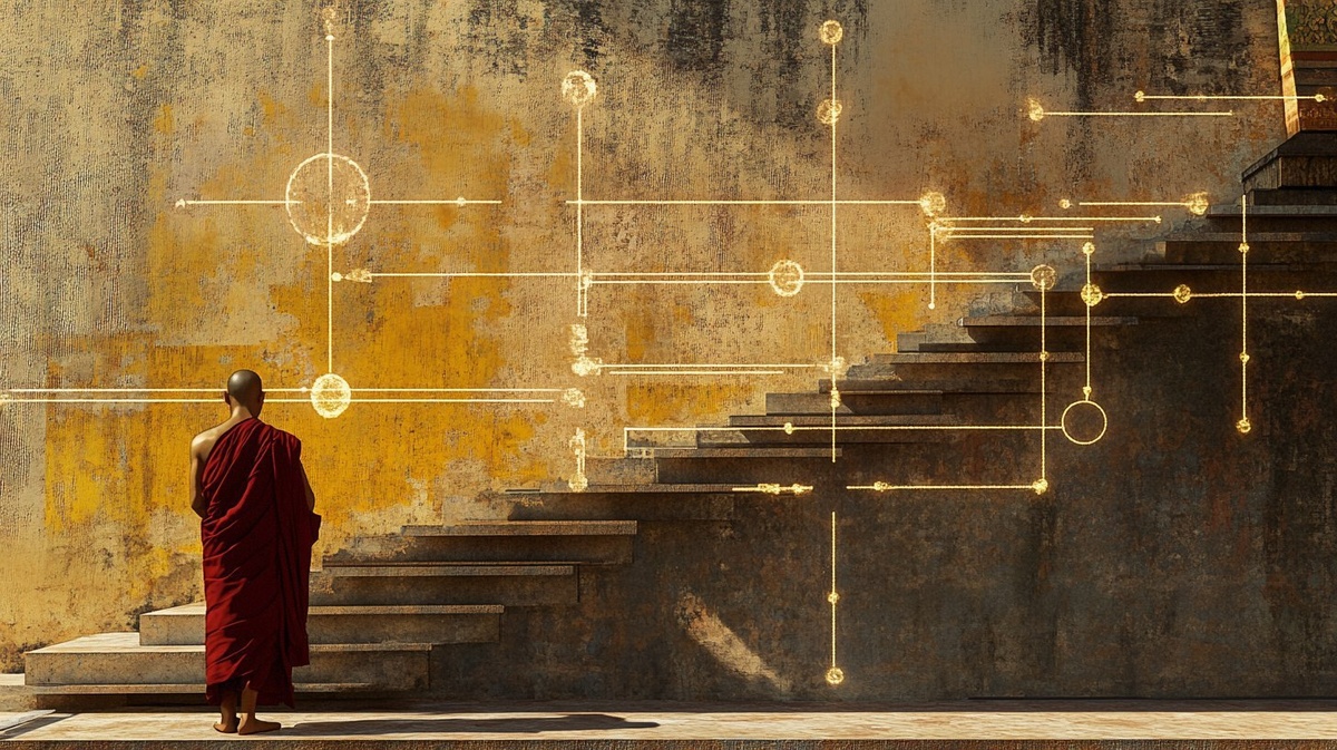 Создано на основе запроса: A symbolic diagram of Dependent Origination drawn on a temple wall, with the monk tracing it in silence light