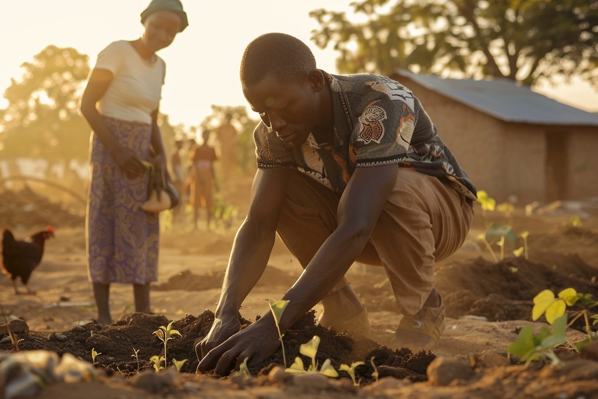 Создано на основе запроса: Photorealistic scene, rural West Africa, golden hour a young African man crouches on dry cracked soil, pressing his hands into the earth with focus and care. A young African woman stands beside him, watching with curiosity and respect. Around them: early signs of ecological regeneration compost piles, mulch, small seedlings emerging from the soil. In the background: villagers planting agroforestry rows (banana, moringa, cassava), chickens roaming, simple adobe houses, rainwater barrels. Natural lighting, soft dust in the air, warm earthy tones, cinematic depth of field, 85mm lens look, realistic documentary style, no fantasy elements. --- Автоперевод: Фотореалистическая сцена, сельская Западная Африка, Золотой час. Молодой африканский мужчина приседает на сухой потрескавшейся почве, прижимая руки к земле с фокусом и заботой. Красиво получилось? 🤔 https://dzen.ru/id/65c0c65c86e4f837c27b24d7 #ИИ #AI #нейросеть #midjourney #art