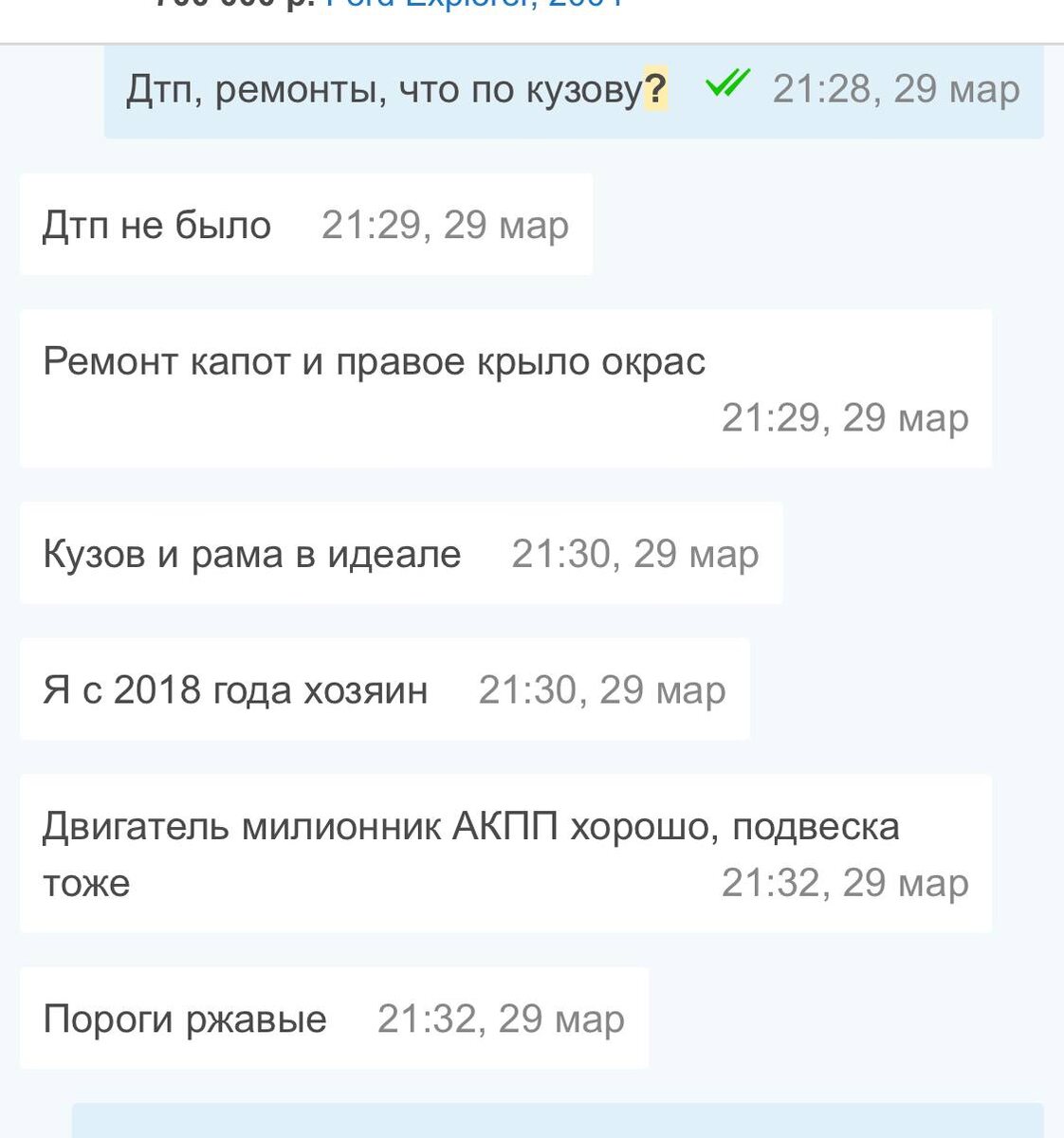 Ford Explorer V8. Теперь автомобили с ценой от 1 млн рублей за 3-е поколение. Но был еще и за 800. Это Алтайский край. Напомню поиск и подбор был именно третьего поколения с мотором 4.6 на 242 силы. В четвертом поколении уже 295 сил, другая КПП и немного доработанный мотор. Четвертое лучше по техничке, но мотор уже попадает под налог. В Алтайском крае вариант за 800, когда я с ним общался, цена была 870. После договоренности на осмотр, человек перестал брать трубку и вышел на связь только через неделю. По авто: 2003 год, машина осталась от деда, перешла по наследству. Первично: из самого яркого- это новое колесные диски-обычно, когда машина - хлам, новые диски немного оттеняют недостатки. Пороги и арки под замену, сгнили. Низ дверей сгнил. Бита по передней части. Продавалась с января 2024 с мертвой КПП. Плюс этой машины - два собственника - это для тех, кто покупает ПТС, а не автомобиль. Далее Ford Explorer 2004 года V8 в Перми. На учете не стоит два года. Достался по наследству. Вла
