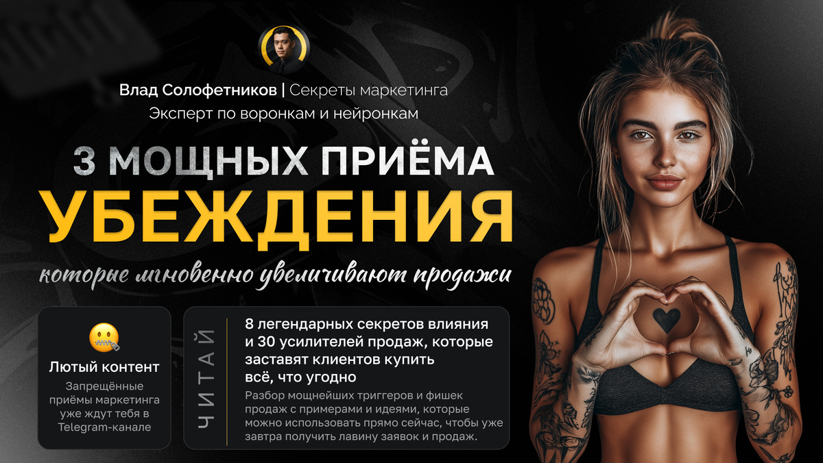 Этот пост для тех, кто к 30 годам планировал ездить на желтом Ламборгини, а сейчас радуется желтым ценникам в «Пятерочке» 😂. Знаешь, почему твой контент, сторисы, реклама или воронка порой не работают, как хочется? Все очень просто. Они не вызывают сильного желания купить. Множество исследований подтверждают, что рекламные кампании и слоганы брендов, которые вызывают эмоции, работают в три-четыре раза эффективнее тех, что основаны на логике и фактах. Что это значит для тебя? Мы, люди, принимаем решения о покупке эмоционально, а потом уже объясняем их логически. И вот тут скрыт секрет успеха: Если хочешь, чтобы клиенты покупали, начинать нужно с эмоций. Привлеки, зацепи, создай желание. А затем укрепи его логическими доказательствами: фактами, цифрами, статистикой. Именно так рождается то самое непреодолимое желание купить. Но как его вызвать? Есть три приёма убеждения, которые мгновенно увеличивают продажи. Я лично использовал и тщательно тестировал каждый из них на протяжении несколь