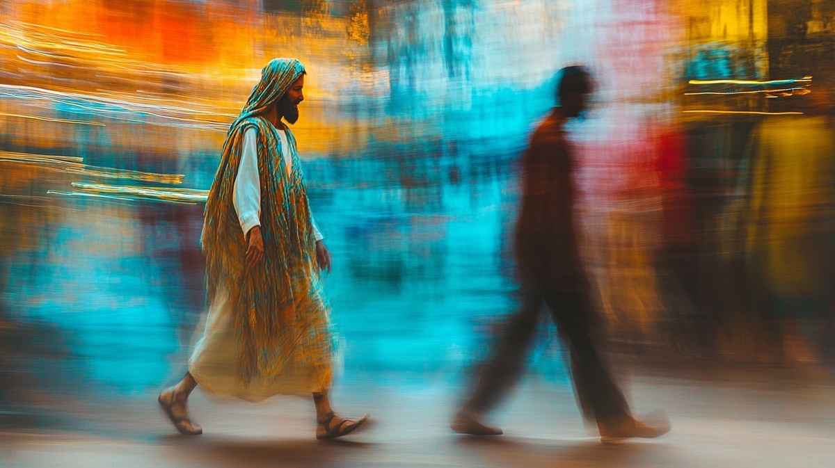 Создано на основе запроса: low shutter speed style image of middle eastern jesus and a african american man walking by each other