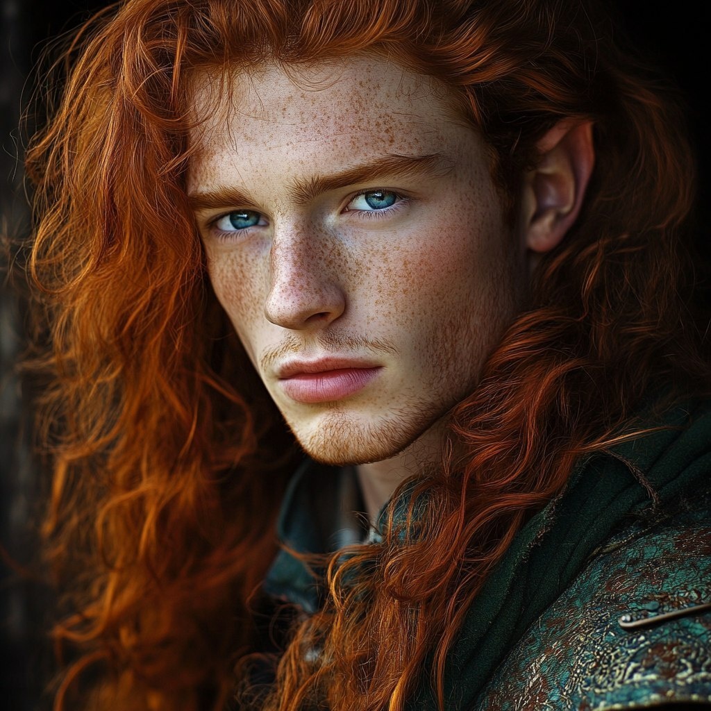 Создано на основе запроса: a fae like young man with long red hair, bright blue eyes with slightly pointed ears dressed as a 14th Scottish