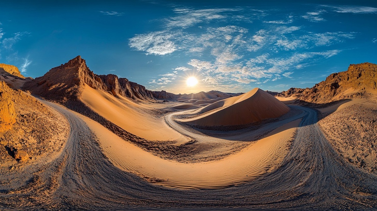 Создано на основе запроса: A very wide angle view of the Badain Jaran desert at noon