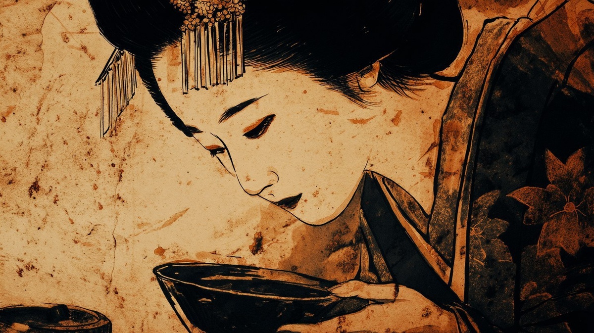 Создано на основе запроса: an old geisha in a tea ceremony, closeup, sepia, wornout old papyrus, hypermaximalist watercolored by coffee