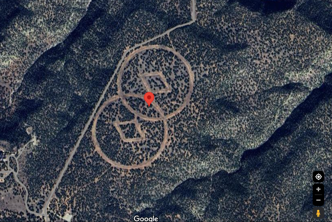 В пустынной местности Меса-Хуэрфанита видны два больших алмаза, окружённых кругами. Это объект Церкви саентологии.