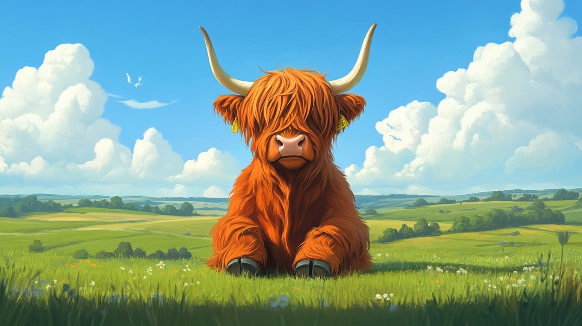 Создано на основе запроса: frontal view, centered in frame, cartoon image of a brown scottish highland cow sitting on its rear like a human in a verdant green pasture with blue skys overhead --- Автоперевод: Фронтальный вид, в центре рамы, мультфильм изображение коричневой шотландской горной коров Интересно вышло? 🤔 https://dzen.ru/id/65c0c65c86e4f837c27b24d7 #ИИ #AI #нейросеть #midjourney #art