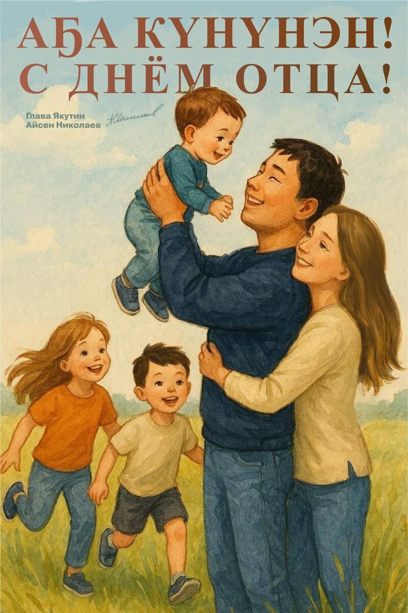 С Днём отца! Аҕа күнүнэн! Отец — это не только опора семьи, но и защитник Родины. Он — воплощение силы, надёжности, доброты и внутреннего достоинства. Его пример учит жить по совести, уважать труд, быть рядом, когда это действительно нужно, и любить свою землю не на словах, а делом. В этот праздничный день — слова благодарности каждому отцу. За терпение. За силу. За верность семье. Пусть в ваших домах будет тепло, а в сердцах — гордость за сделанное и вера в будущее. Благодаря мужской стойкости, созидательной энергии и любви к родной земле Якутия уверенно движется вперёд — как регион, как часть великой России. Аҕа үүнэр көлүөнэҕэ төрөөбүт дойдуга тапталы, тулалыыр эйгэҕэ харыстабыллаах сыһыаны иҥэрэр, эр санаалаах буоларга, дьоһун киһи, дьиэ кэргэн бигэ тирэҕэ буоларга иитэр-такайар. Сахабыт Сирин аҕаларыгар итии-истиҥ эҕэрдэбин, дьолу-соргуну, халлаанах айыы-санааны баҕарабын! t.me/aisen_nikolaev