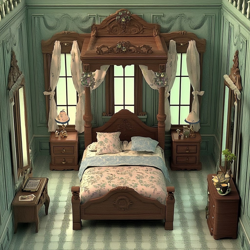 Создано на основе запроса: aerial view of a rococo style dollhouse bedroom, ornamental, flamboyant, and intricately detailed, gold trim