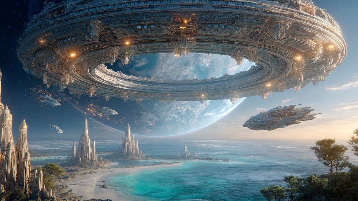 Создано на основе запроса: A concept art scifi fantasy landscape, advanced technology spaceship in orbit above an alien planet, 64K UHD