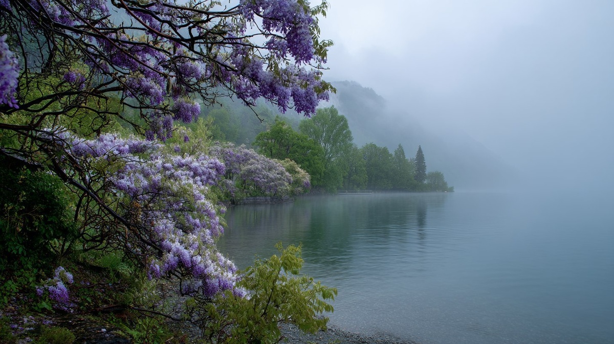 Создано на основе запроса: The scene is of a sunny and misty morning in the mountains in valley at sunrise. The fog envelops the mountain tops, making visibility difficult. The lake is calm and still, surrounded by beautiful wisterias trees, reflecting the mist around it. The wisteria trees on the lake's shore are covered in dew and the leaves are wet. The silence is only broken by the birdsong and the soft sound of waves lapping at the shore. The atmosphere is mysterious and enchanting --- Автоперевод: Сцена солнечного и туманного утра в горах в долине на рассвете. Отлично вышло? 🤔 https://dzen.ru/id/65c0c65c86e4f837c27b24d7 #ИИ #AI #нейросеть #midjourney #art