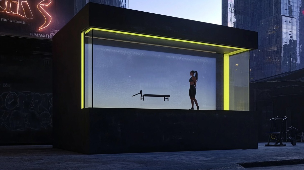 Создано на основе запроса: rhino 3d previs render of plan to build pop render in times square of black box elevated up on black box pedestal with one glass front inside is minimal dark concrete floor and dark concrete backwall, and one weight lifting eqipment, equipment and a model woman personal trainer helping person bench press, concrete floor and backwall yellow green neon rim around edge of window, elevated off the ground, hovering five feat off the grond