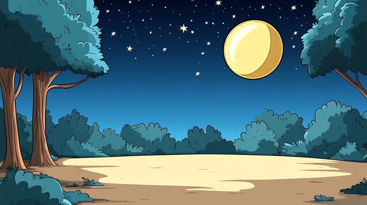 Создано на основе запроса: a children's book illustration of a night scene, stars are twinkling above with the moon. The ground is clear.